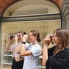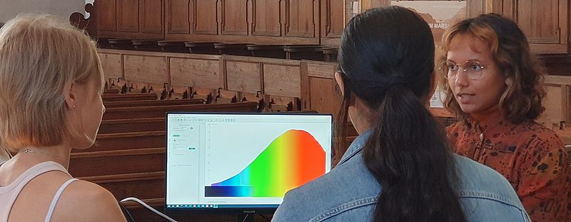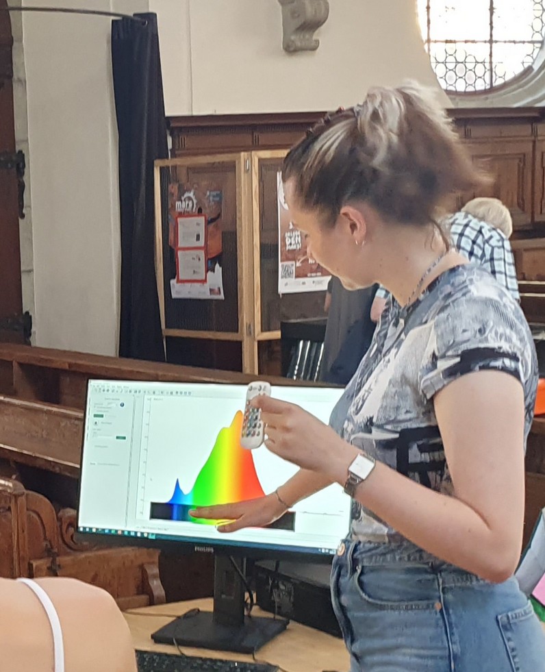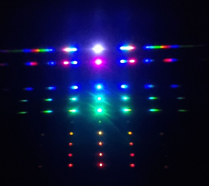 Gut zu erkennen: die oberste weiße LED sendet kein weißes (= kontinuierliches) Licht, sondern setzt sich aus den drei Fraben rot, grün und blau zusammen. Ebenso gibt es im natürlichen Spektrum kein rosa (zweite LED von oben) - diese Farbe setzt sich aus rot und blau zusammen.
