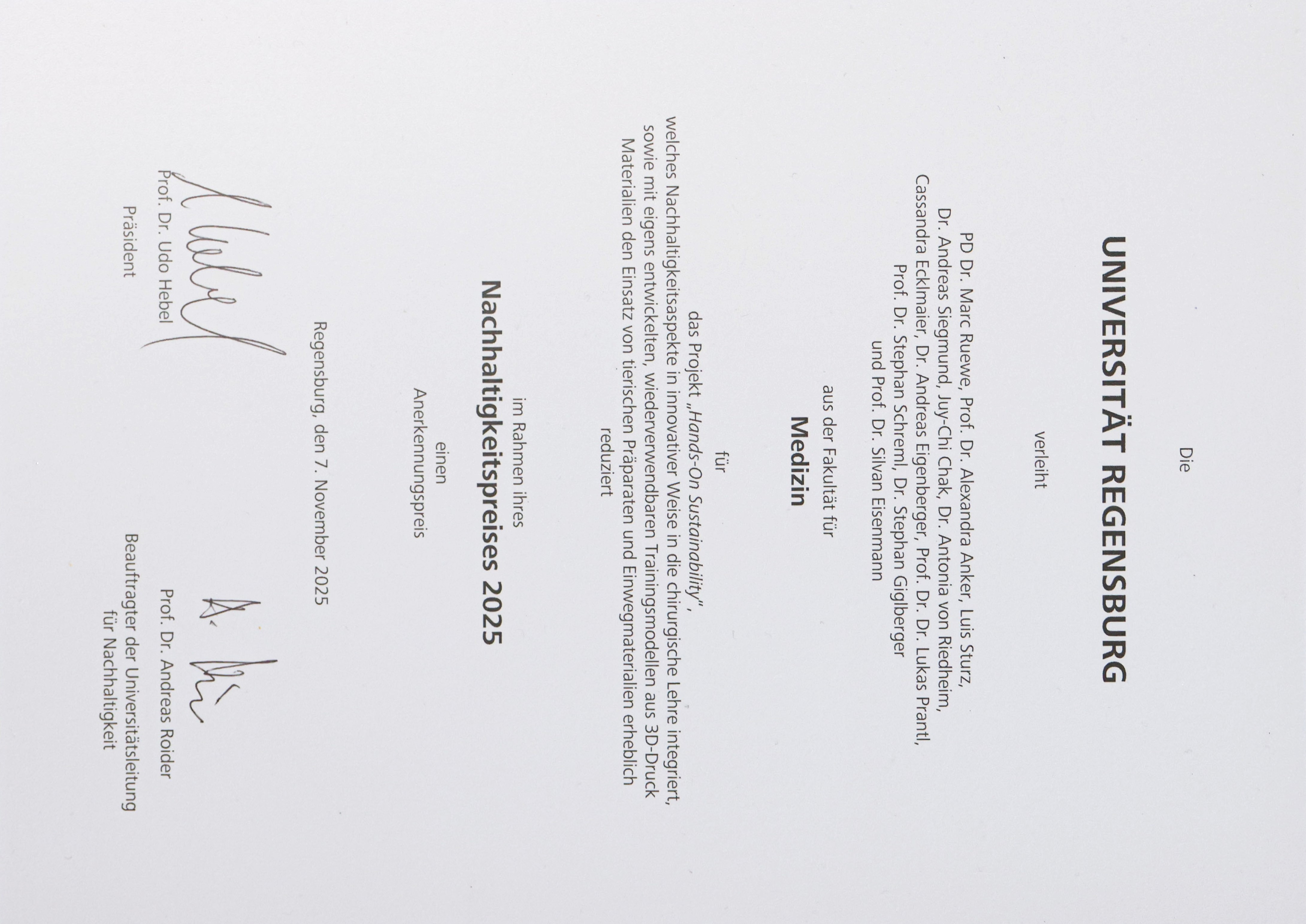2025 - Anerkennungspreis (2. Platz) im Rahmen des Nachhaltigkeitspreises 2025 der Universität Regensburg für das Projekt "Hands-On Sustainability"