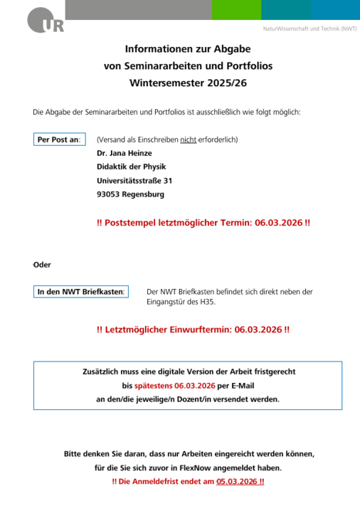 ab 01.09.2026 sind an der Universität Regensburg im Didaktikfach NaturWissenschaft und Technik (NWT)