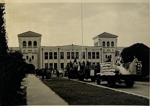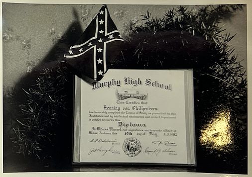 Zu sehen: die 6 farbigen Fahnen, insbesondere die Confederate Flag. Diese erscheint außen auf dem später erhaltenen 1952 Mohian Yearbook, published by Senior Class Murphy High School, Mobile Alabama. Ein Leitspruch von Schule und Stadt war „Down South in the land of cotton - times of old are not forgotten“.