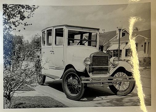 Rückseite mit Text + Foto der Zwillinge mit Confederate Flag und ihr Model T 1926.