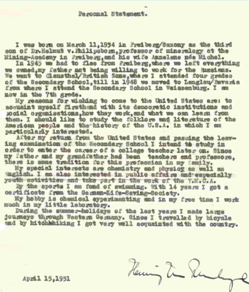 18.8.51 Original 2. Exemplar: American Field Service International Scholarships, 113 East 30th Street New York16, N.Y. Award of Scholarship to Henning vonPhilipsborn. 31 (131) Langlau/Mfr., Bavaria, Germany: It gives me great pleasure to inform you + The forgoing Award of Scholarship has been read by us, we understand its terms and we agree to abide by them. Student: Henning von Philipsborn. Parent or guardian: Hellmut v. Philipsborn Date Stephen Galatti, Director General.