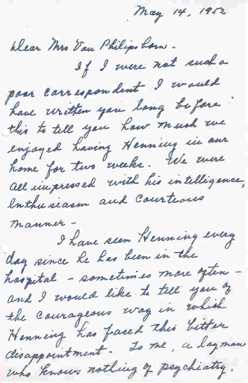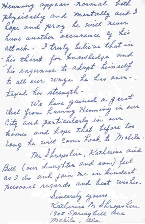 Wegen der für mich als deutschen Jugendlichen ganz ungewohnten gesellschaftlichen Beanspruchungen erhielt ich ohne eigenes Schlafzimmer zu wenig Schlaf. Als ich Mittwoch 23. April spät abends im Hause der Caters noch stand, spürte ich - wie schon einmal als Flüchtlingskind – ich werde ohnmächtig, schnell hinlegen. Man rief einen Notarzt. Da war ich schon wieder wach. Ohne zu warten sagte Notarzt sofort „stroke“ (Schlaganfall). Mr. Shropshire, ein anwesender Freund der Caters kannte mich sehr gut. Ich war einmal 2 Wochen Gast im Hause der Shropshires mit Sohn Bill (5. Sem) gewesen. Jetzt sagte er „No, Henning got not enough sleep“. Doch wurde ich für 2 Wochen in ein Krankenhaus entsorgt, obwohl mir nur Schlaf gefehlt hatte. Der Brief vom May 14, 1952 von Mrs. Shropshire an meine Mutter: