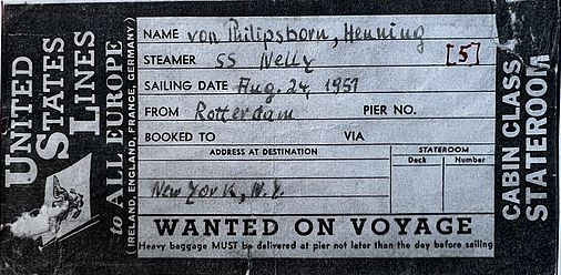 16.08.51 Erhalte Travel Orders, kostenlose Fahrkarte nach Frankfurt, dort Unterkunft, Weiterreise Rotterdam, Abfahrt des Schiffes am 24.8. mit Ms Nelly.