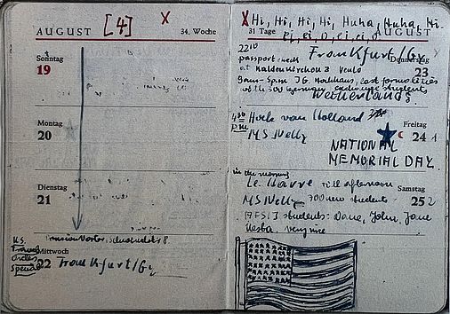 Mini-Taschenkalender 1951 zeigt die 34. Woche: August: Mittwoch 22.8. hand-schriftliche Eintragung Pension Norter Schwindstr. 8. Frankfurt/Gy. Im heutigen Inter-net gibt es heute dort noch eine Pension. Donnerstag 23.8. Frankfurt/Gy 2210 passport check at Kaldenkirchen, 9 am-5 pm, IG Hochhaus, last formalities with 300 German exchange students Freitag 24.8. 430 pm Hoek van Holland Ms Nelly, großer 5-Zack-Stern Samstag 25.8. in the morning Le Havre till afternoon Ms Nelly 700 new students. Unteres 7’tel mit der US-Fahne links mit 6 x 8 5-Zack-Sternen.