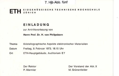 Am Freitag 9. Februar 1973 hielt ich meine Antrittsvorlesung an der ETH Zürich zum Thema „Kristallographische Aspekte elektronische Materialien“. (Abb. 5)