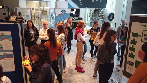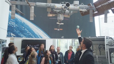 The head of DLR_School_Lab Oberpfaffenhofen, Tobias Schüttler, gives a tour of the DLR's German Space Operations Center (GOSC). He points to a model of the ISS: among other things, the Columbus module of the ISS is controlled from Oberpfaffenhofen.
