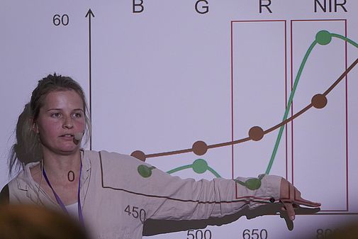The presentation by Dr Sophie Reinermann entitled ‘Heat and Drought in Germany - Analysis of Long-Term Earth Observation Time Series of Vegetation Condition’ shows the work of the scientist and the methods she uses to collect the data. The analysis of satellite images with decomposition into the colour channels blue, green, red, NIR (near infrared) and mid infrared allows vegetation (i.e. photosynthesising plants) to be detected with high contrast so that the ground areas to be analysed can be quantified.