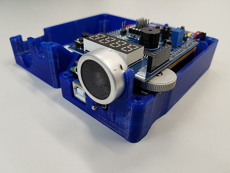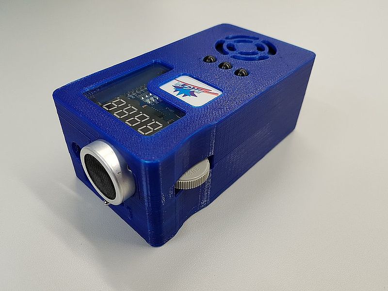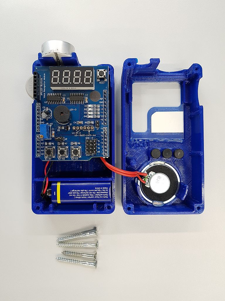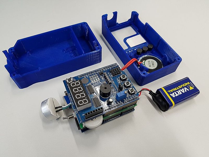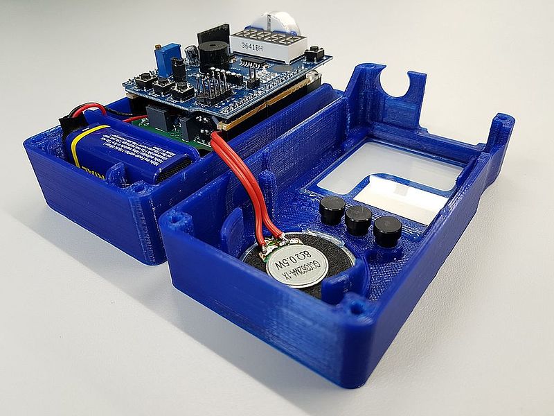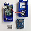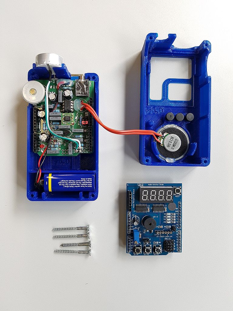 ![]() | Der Detektor findet in einem 3D-gedruckten Gehäuse Platz, das den Arduino Uno, das Universal-Shield, Lautsprecher und Batterie beinhaltet. Die Druckdaten kann man hier downloaden. Die Software ist recht simpel: über zwei Knöpfe kann man den internen Oszillator in 2kHz-Schritten erhöhen bzw. erniedrigen, mit dem dritten Knopf wird ein Auto-Scan ausgelöst. Der Arduino-Sketch ist hier zum download |