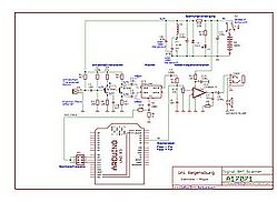 | Der Schaltplan teilt sich grob in folgende Bereiche: links der Ultraschall-Vorverstärker, darunter der Arduino, der das Mischsignal generiert. In der Mitte rechts folgt ein Audioverstärker, der das Mischprodukt (Summe bzw., Differenz) verstärkt. Im oberen Teil rechts ist die Spannungsversorgung zu sehen. Zum Download. | |