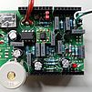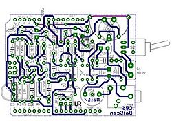 ![]() | Hier das Platinenlayout für das Arduino-Shield, das zwischen Uno und Universal-Shield platziert wird (Sandwich). Das SMD-IC SA612AN wurde vorab auf eine Adapterplatine gelötet und kann daher nun in einen Standard-Sockel gesteckt |