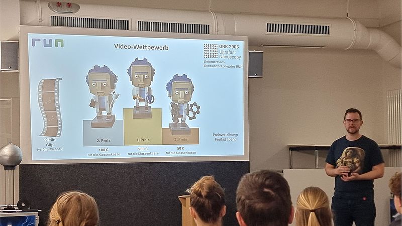Die Schülerinnen und Schüler erstellen während der Workshops ein Dokumentationsvideo über die Veranstaltung. Die drei besten Videos werden am Abend im Rahmen von Physik goes Downtown gezeigt und prämiert.