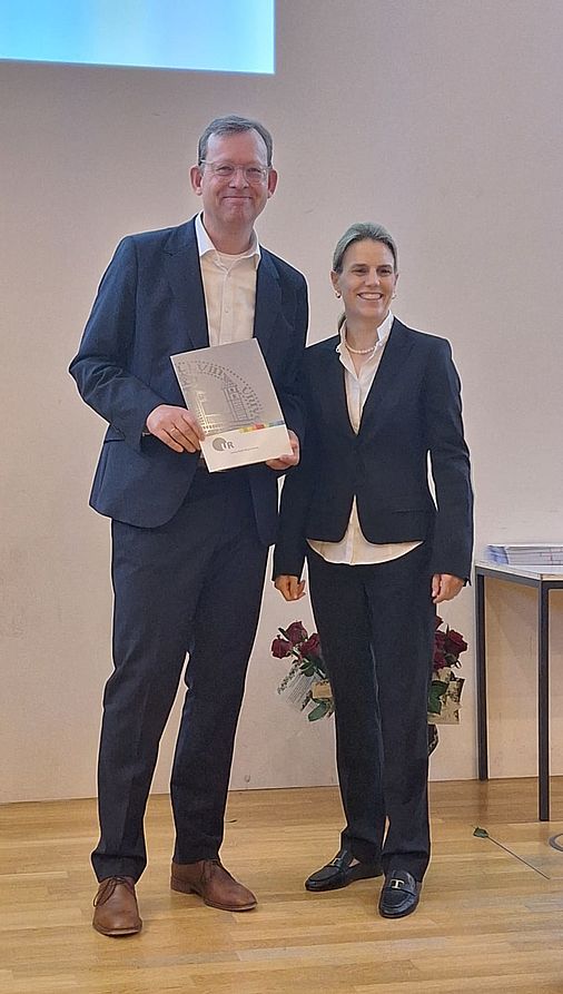 Auch Lehrende wurden im Rahmen der Feierlichkeit ausgezeichnet: Studiendekanin Professor Mayer überreichte Herrn Professor Kühling für seine Vorlesung „Datenschutzrecht“ und Herrn Rambach für seine „Konversationsübung zur Vorlesung BGB II“ jeweils den Lehrpreis der Fakultät für das SS 2024. Am Ende der Feier nahm Frau Vandijck ihren und den der abwesenden Kommilitonin Frau Rieger, Buchpreis des Dekans in Empfang, der ihnen für ihr großes Engagement in der Fachschaft und v.a. im Fakultätsrat von Professor Kingreen mit Dankesworten überreicht wurde.