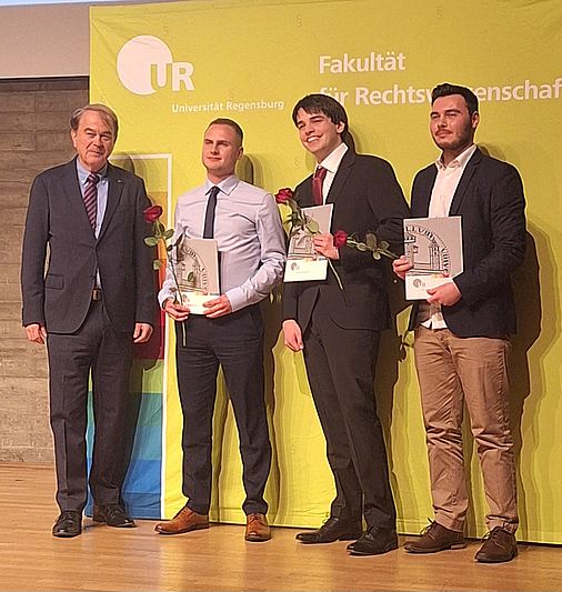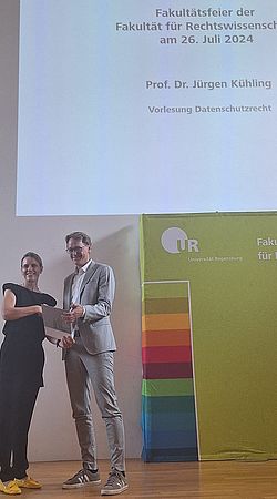 Im Sommersemester 2024 wurden Herr Professor Kühling für seine Vorlesung "Datenschutzrecht" und Herr Christian Rambach für seine "Konversationsübung zur Vorlesung BGB II" ausgezeichnet. Die Urkunde überreichte die Studiendekanin, Professor Mayer. Ziel dieser Lehrevaluation ist es, die Qualität der Lehre stetig zu verbessern. Mehr Informationen zu der Lehrevaluation finden Sie hier.