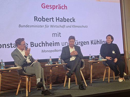 Mit etwa 200 Gästen aus Politik, Wissenschaft, Behörden, Gerichtsbarkeit, Unternehmen, Verbänden und Medien hat die Monopolkommission im Berliner Wirtschaftsministerium am 5. Juni 2024 ihren 50. Geburtstag gefeiert. Unter der Gesamtmoderation des Vorsitzenden Prof. Kühling haben spannende Referentinnen und Referenten aus den genannten Bereichen lebhaft über das Generalthema „Wettbewerb im Spannungsfeld von Industriepolitik und ökologischer Transformation“ diskutiert. Inspirierende Festvorträge hielten u.a. das bekannte Mitglied im Sachverständigenrat, die Nürnberger Ökonomin Veronika Grimm sowie der renommierte Kartellrechtler Rupprecht Podszun, der Kühling im Juli in die Monopolkommission folgen wird. Weitere Impulse kamen u.a. von den ehemaligen Vorsitzenden Justus Haucap (Uni Düsseldorf), Daniel Zimmer (Uni Bonn) und Achim Wambach (Präsident ZEW). Die Veranstaltung schloss mit einer Keynote von Wirtschaftsminister Habeck, der sich im Gespräch den Fragen von Kühling und Kommissionsmitglied Buchheim stellte.