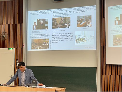 Herr Théofilakis führte mit seinem Vortrag entlang des Projekts „Filmer les procès: un enjeu social“, welches er ursprünglich für das französischen Nationalarchiv mitkonzipiert hatte. Nach einer Einführung in die französische Rechtslage bezüglich Kameras in Gerichtssälen, der Ausarbeitung relevanter Fragestellungen in diesem Kontext und einer mit eindrucksvollem Bild- und Videomaterial untermauerten Übersicht über historisch signifikante Prozesse der französischen Rechtsgeschichte, u.a. die Anklage des NS-Offiziers Klaus Barbie, fokussierte sich Herr Théofilakis in der zweiten Hälfte schließlich speziell auf Aufnahmen des Eichmann-Prozesses.