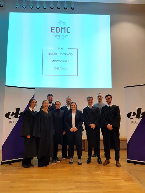 Am Donnerstagabend, den 25. Januar 2024, fand im gut besuchten H 24 des Vielberth-Gebäudes der diesjährige Regensburger Lokalentscheid des ELSA-Deutschland Moot Court (EDMC) statt, bei dem die teilnehmenden Studierenden in die Rolle von Anwältinnen und Anwälten schlüpfen durten und vor einer dreiköpfigen Jury einen fiktiven Sachverhalt verhandelten.