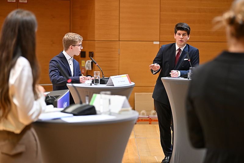 Bei dieser Themenvielfalt fiel es der Jury, die aus Dr. Ruprecht Freiherr von Maltzahn (Managing Associate bei der Wirtschaftskanzlei Linklaters), Dr. Timo Engelhardt (Partner bei der Wirtschaftskanzlei Linklaters) und Dagmar Unrecht (Redakteurin bei der Mittelbayerischen Zeitung), bestand, schwer, die Sieger und Siegerinnen der ersten Runde zu ermitteln. Letztlich zogen Georg Freiß, Alina Almer, Maximilian Ehmann und Tobias Ostner in die zweite Runde ein. In dieser Runde wurde über die Frage „Klimakrise: Brauchen wir eine Änderung des Grundgesetzes?“ diskutiert, wobei die Pro- und Contra-Positionen unter den Teilnehmenden ausgelost wurden.