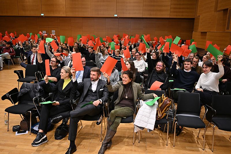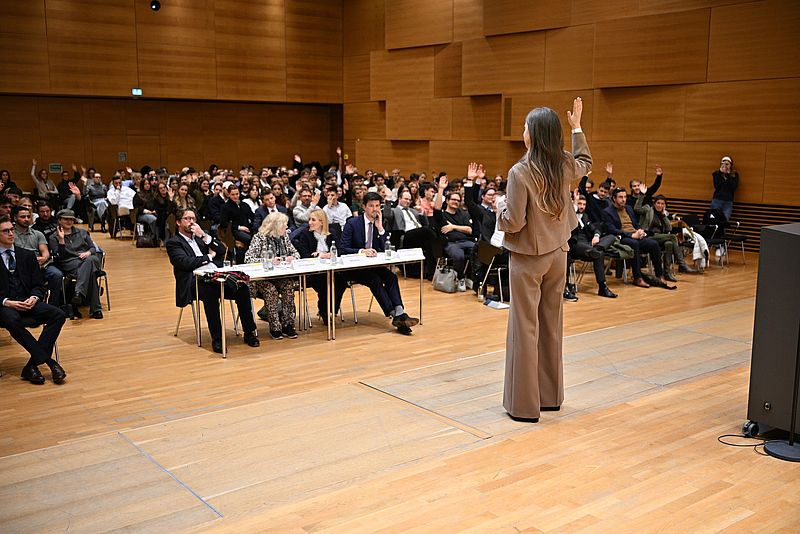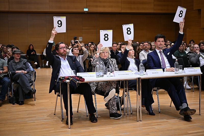 Den ersten Platz machte Anna Kunz von der Universität Passau. Dr. Timo Engelhardt erklärte, warum die Jury ihr die meisten Punkte zugesprochen hatte: "Frau Kunz hat sich bei ihrer frei vorgetragenen Standpunktrede nicht hinter dem Rednerpult versteckt und hat kein ganz einfaches Thema gewählt. Bei der Podiumsdiskussion hat sie die Argumente der Gegenseite aufgenommen und auch das Publikum mit einbezogen." Der zweite Platz ging an Jan Morawitz-Bardenheuer von der LMU, der dritte an Nicola Antretter von der Universität Passau.