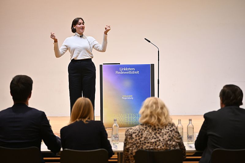 Seit nunmehr fünf Jahren organisiert das universitäre Ausbildungszentrum REGINA den Linklaters Redewettstreit unter Jurastudierenden. Diese besondere Lernform juristischer Schlüsselqualifikationen gibt den Studierenden die Gelegenheit, rhetorische und argumentative Kompetenzen nicht nur zu trainieren, sondern auch vor einem großen Publikum zu präsentieren. Die zehn Teilnehmenden zeigten ihre Überzeugungskraft zunächst in fünfminütigen Standpunktreden, z.B. zu den Fragen „Brauchen wir mehr Umverteilung?“ oder „Hat jeder das Recht auf Strafverteidigung?“. Im Anschluss an jeden Redebeitrag stellte ein Jurymitglied noch eine Nachfrage. In einer zweiten Runde diskutierten die Studierenden, ob es auch auf Bundesebene Bürgerentscheide geben solle. Die Bewertung übernahm eine interdisziplinäre Jury, der u.a. Frau Bürgermeisterin Gertrud Maltz-Schwarzfischer angehörte. Namensgeber und Sponsor des Redewettstreits ist die weltweit tätige Wirtschaftskanzlei Linklaters.