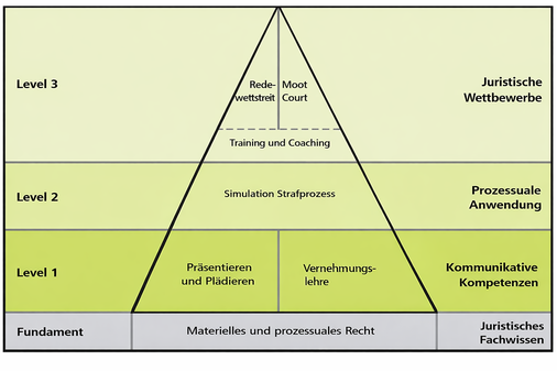In einem ersten Level werden die grundlegenden Kompetenzen für juratypische Kommunikationssituationen vermittelt und geübt. Darauf aufbauend haben die Studierenden in einem zweiten Level die Gelegenheit, unter Anleitung die erlernten Kompetenzen in Prozesssimulationen (derzeit ausschließlich im Strafrecht) anhand realistischer Fälle aus der juristischen Praxis weiter einzuüben. Schließlich können die Studierenden im dritten Level nach einem individuellen REGINA-Training ihre Fähigkeiten mit Studierenden der eigenen Universität und anderen juristischen Fakultäten in Moot Courts oder dem Regensburger „Linklaters Redewettstreit“ messen. Die Levels bauen vom Herausforderungsniveau aufeinander auf – ein Direkteinstieg in Level 2 oder 3 ist jedoch möglich.