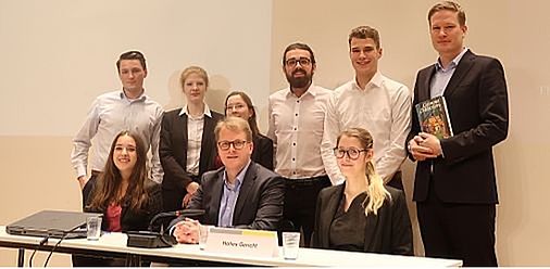 Nach der umfassenden Einführung in den Sach- und Streitstand durch das Gericht konnten die Parteien sogleich ihr Können unter Beweis stellen. Wie in einer echten Verhandlung begründeten sie ihre Positionen und beantworteten Fragen dazu. Bevor die drei Richter nach den beiden einstündigen Verhandlungen ihr Urteil verkündeten, diskutierte das Publikum, die Teilnehmenden und Lehrstuhlmitarbeitenden bei einem kleinen Imbiss und Umtrunk vor dem Hörsaal noch die Eigenheiten des Falles.