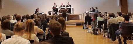 Mit einer umfassenden Einführung in den Sach- und Streitstand stellte das Gericht nicht zuletzt auch dem Publikum nochmals den Sachverhalt dar, woraufhin die beiden Parteien wie in einer echten Verhandlung ihre Positionen begründen und Fragen dazu beantworten mussten. Strittige Punkte waren durch die geschickte Vernehmung eines Zeugen zu klären. Bevor die drei Richter dann nach der einstündigen Verhandlung ihr Urteil und ihre Juryentscheidung verkündeten, erläuterte Prof. Dr. Frank Maschmann dem interessierten Publikum nochmals die zuvor von den Parteien diskutierten arbeitsrechtlichen Probleme.