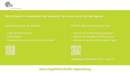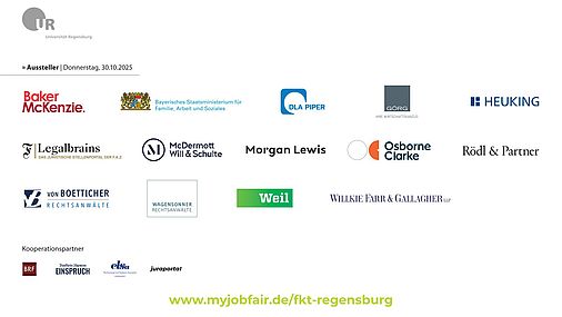 Die myjobfair GmbH, Kooperationspartner der Fakultät für Rechtswissenschaft zur Organisation des Regensburger Fakultätskarrieretages, bietet mit einem eigenen Job-Portal eine Plattform für Stellenangebote. Sie finden dort Angebote für Praktika und studentische Nebentätigkeiten sowie Stellen für ReferendarInnen und BerufsanfängerInnen. Das Job-Portal erreichen Sie hier.