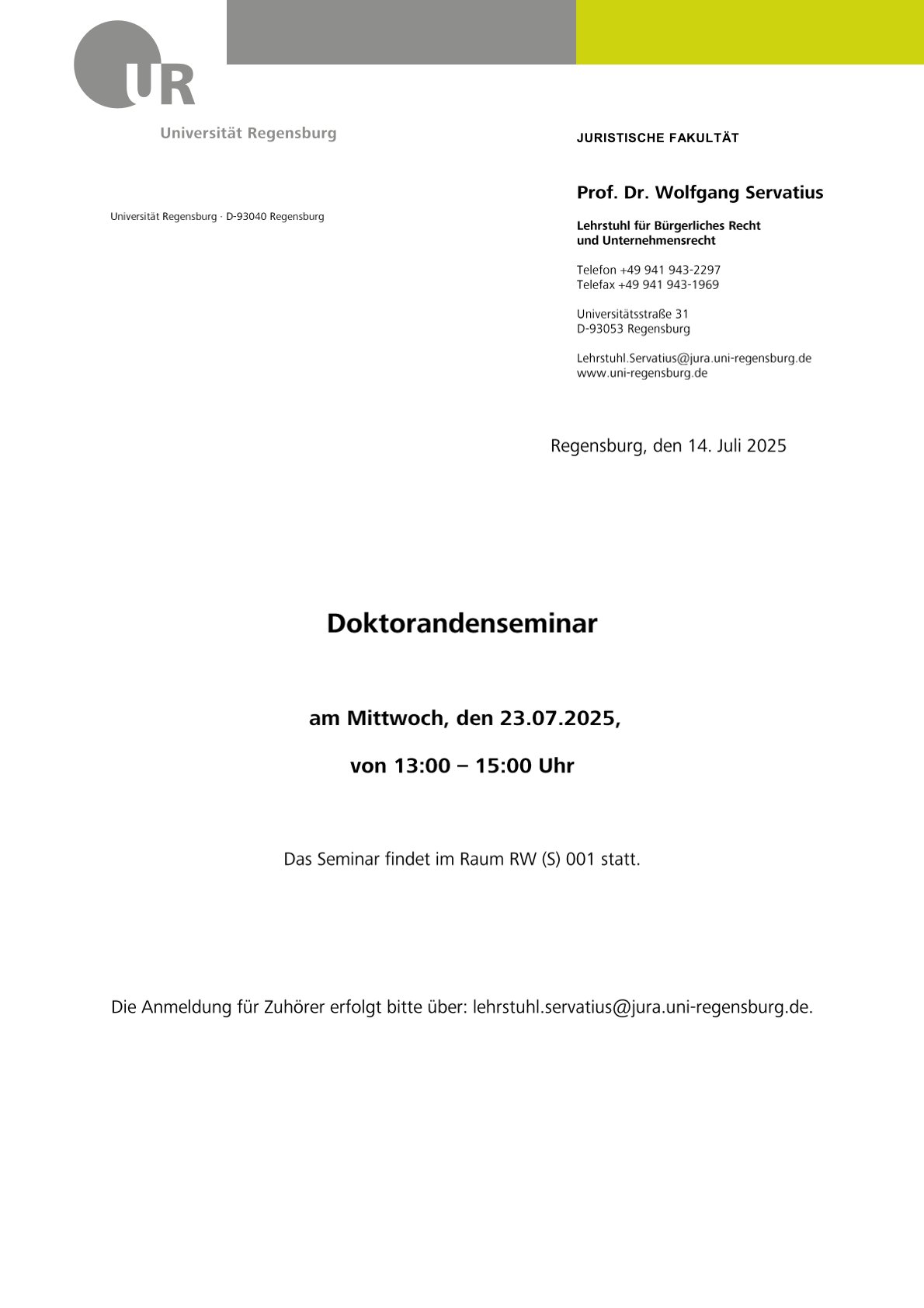 veranstaltet Prof. Dr. Jürgen Kühling ein Doktorandenseminar. Mehr Informationen
