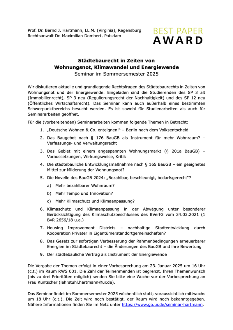 Im Sommersemester 2025 bietet Professor Hartmann zusammen mit Rechtsanwalt Dr. Dombert (Dombert Rechtsanwälte) ein Seminar zum Städtebaurecht an. Wir diskutieren aktuelle und grundlegende Rechtsfragen des Städtebaurechts in Zeiten von Wohnungsnot, Klimawandel und der Energiewende. Eingeladen sind die Studierenden des SP 3 alt (Immobilienrecht), SP 3 neu (Regulierungsrecht der Nachhaltigkeit – RRN) und des SP 12 neu (Öffentliches Wirtschaftsrecht – ÖWiR). Das Seminar kann auch außerhalb eines bestimmten Schwerpunktbereichs besucht werden. Es ist sowohl für Studienarbeiten als auch für Seminararbeiten geöffnet. Wer die beste Seminarleistung erbringt, erhält als Anerkennung eine Urkunde und ein Buch nach Wahl aus der Studienliteratur des Nomos-Verlags. Mehr zu der Auszeichnung mit dem Best Paper Award erfahren Sie hier.