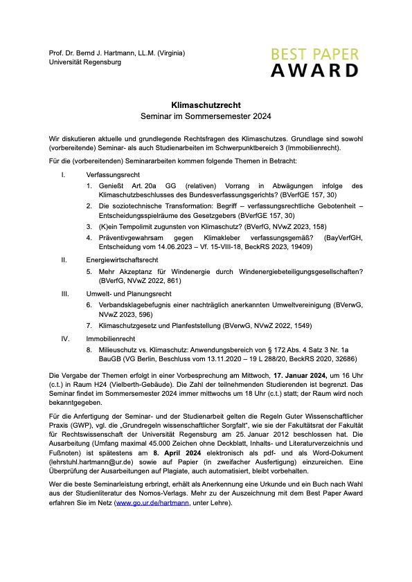 Im Sommersemester 2024 bietet Professor Hartmann ein Seminar zum Klimaschutzrecht an. Wir diskutieren aktuelle und grundlegende Rechtsfragen des Klimaschutzes. Grundlage sind sowohl (vorbereitende) Seminar- als auch Studienarbeiten im Schwerpunktbereich 3 (Immobilienrecht).