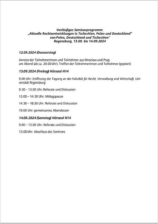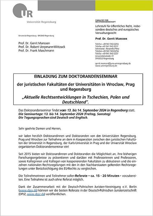 Im Juni 2017 wurden die bereits seit den 1970ger Jahren bestehenden regelmäßigen wissenschaftlichen Kontakte zwischen der Fakultät für Rechtswissenschaft der Universität Regensburg und der Fakultät für Recht, Verwaltung und Ökonomie der Universität Breslau vertieft. Vier Regensburger Professoren (Prof. Manssen, Prof. Schroeder, Prof. Uerpmann-Wittzack, Prof. Cornelius) sowie fünf Doktorandinnen und Doktoranden folgten der freundlichen Einladung von Frau Dr. Agnieszka Malicka (Leiterin der Fremdsprachenausbildung an der dortigen Fakultät und Direktorin des Zentrums für deutsches Recht), die für die Organisation in Breslau verantwortlich war.