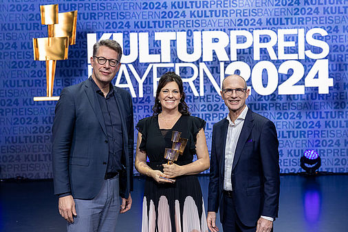 Dr. Carolin Donhauser-Buchmaier wurde durch den Bayerischen Kunst- und Wissenschaftsminister Markus Blume (l.) und Bayernwerk-Chef Dr. Egon Leo Westphal (r.) mit dem Kulturpreis Bayern 2024 ausgezeichnet. Bildquelle: Alex Schelbert/Bayernwerk AG