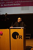 Auch der Dekan der Fakultät, Prof. Dr. Bernhard Dotzler, richtete sich mit persönlichen und einprägsamen Worten an die frisch Graduierten. Er verband seine Glückwünsche mit drei Wünschen: die Freude über den erreichten Abschluss, die Gewissheit, die Universität gelehrter zu verlassen, als man sie betreten habe, sowie die Hoffnung, den „MERK-würdigen Ort“ Universität als prägende Erfahrung in das weitere Leben mitzunehmen.