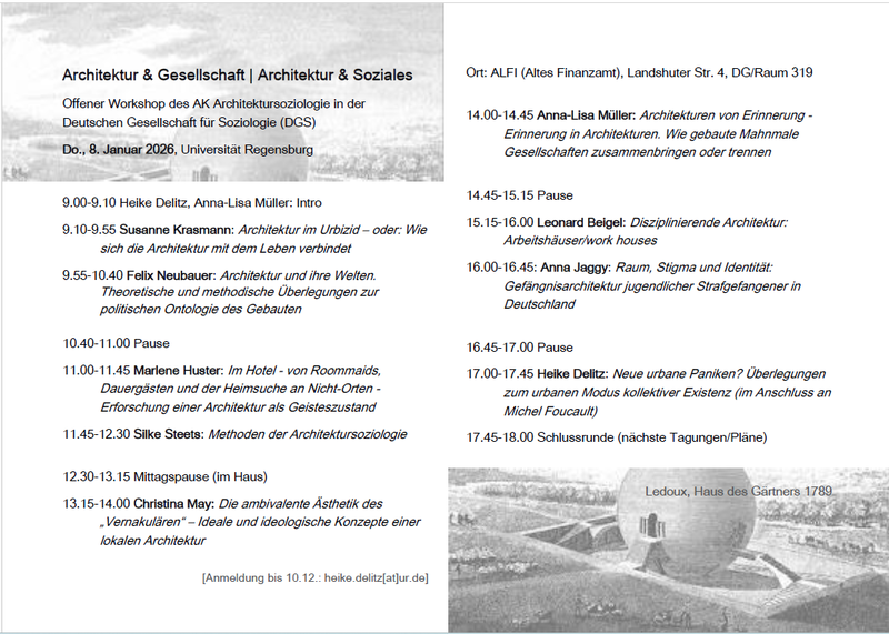 Am 08.01.2026 debattieren neun Wissenschaftler*innen an der Uni Regensburg über den Zusammenhang von "Architektur und Gesellschaft". Das Programm dieses offenen Workshops des AK Architektursoziologie der Deutschen Gesellschaft für Soziologie (DGS) ist jetzt online.