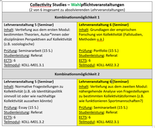 Die Wahlpflichtveranstaltungen vertiefen die Inhalte beider Module (Modul 1 = hellgrau, Modul 2 = gelb). Sie können daher folgende Kombinationen wählen: