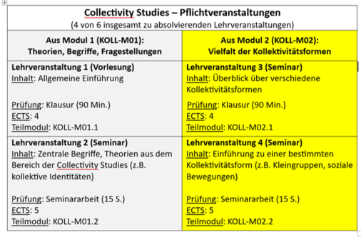 Das B.A.-Nebenfach Kollektivitätsstudien/Collectivity Studies studieren Sie in insgesamt 6 Lehrveranstaltungen (4 x Pflicht, 2 x Wahlpflicht). Diese verteilen sich auf 2 Module. Eine Übersicht finden Sie nachfolgend. Dazu zum Herunterladen: