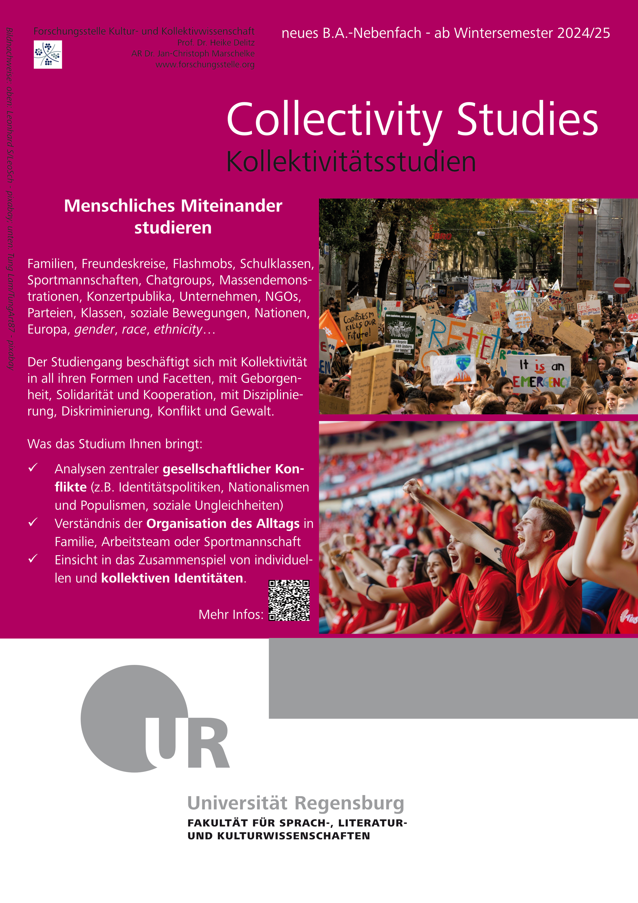 Im B.A.-Nebenfach Collectivity Studies /Kollektivitätsstudien dreht sich alles um Kollektive: von Familien und Freundeskreisen, Fußballmannschaften und Schulklassen, Chatgroups und Flash Mobs, Konzertpublika und Massen(-Demonstrationen), Unternehmen und NGOs, Parteien und soziale Bewegungen über Nationen und indigene Gesellschaften bis zu internationalen Körperschaften und dem Kollektiv der ‚Menschheit‘. Und es geht um die Klassifikationen von Menschen, um deren Einteilung nach gender, race, ethnicity, Klassen, Milieus, Religionen usw. Kollektivität kann dabei ebenso Schutz, Geborgenheit, Empowerment, Solidarität und Kooperation bedeuten wie Disziplinierung, Diskriminierung, Unterdrückung und Konflikt.