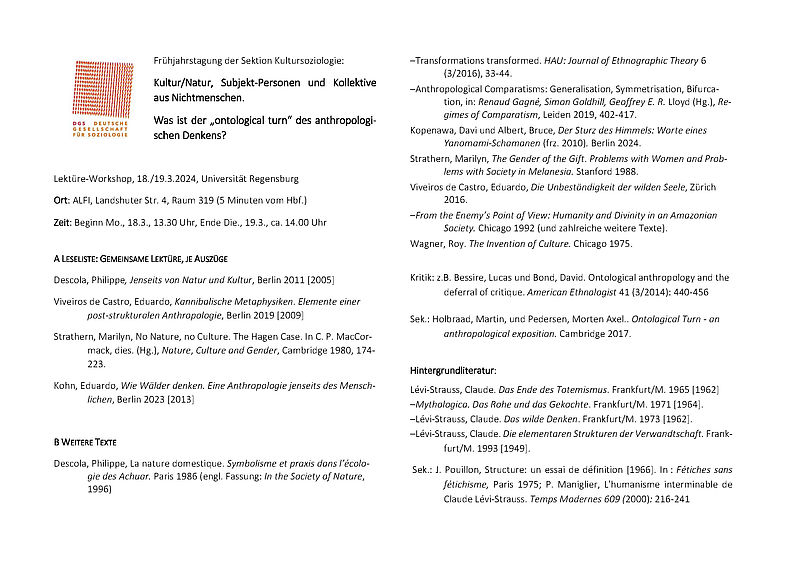 Die Frühjahrstagung der Sektion Kultursoziologie 2024 wird als Lektüre-Werkstatt stattfinden: Jeder Teilnehmer, jede Teilnehmerin liest im Vorfeld die von uns zur Verfügung gestellten Auszüge aus den zentralen Texten (oder mehr, natürlich); und stellt dann zum gemeinsamen close reading je einen Text kurz vor.