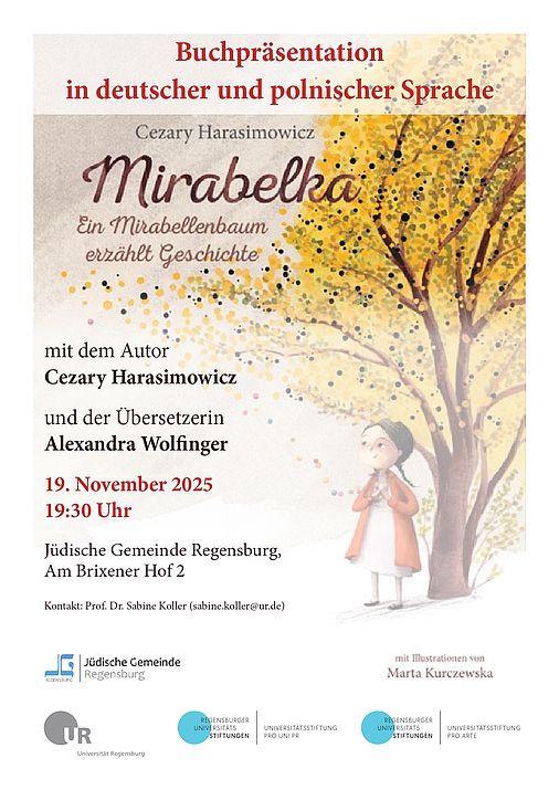 Am 19. November 2025 fand um 19:30 Uhr in der Jüdischen Gemeinde Regensburg die Buchvorstellung des seit kurzem auf Deutsch erhältlichen Kinderbuches "Mirabelka. Ein Mirabellenbaum erzählt Geschichte" statt. Nach einem die Beteiligten und das Buch würdigenden Grußwort der Vorsitzenden der Jüdischen Gemeinde, Frau Ilse Danzinger, lasen der aus Warschau angereiste Autor Cezary Harasimowicz und die Herausgeberin der deutschen Übersetzung, Prof. Dr. Sabine Koller, im Tandem ausgewählte Buchpassagen auf Polnisch und Deutsch. Gemeinsam mit der Übersetzerin Alexandra Wolfinger beleuchteten sie die Hintergründe der Entstehung des Buches und seiner Erstübertragung ins Deutsche.