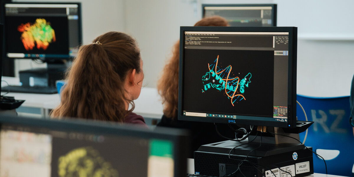 Mit dem Wahlpraktikum „Methodische Ergänzung“ können Sie individuell eigene Interessen vertiefen und zusätzliche experimentelle Techniken erlernen. Ergänzend vermittelt die Bioinformatik wichtige Kompetenzen in der computergestützten Analyse von Gen- und Proteinstrukturen. Den Abschluss bildet die Bachelorarbeit im sechsten Semester – Ihre erste eigenständige wissenschaftliche Arbeit, in der Sie eine aktuelle Fragestellung experimentell im Labor untersuchen.