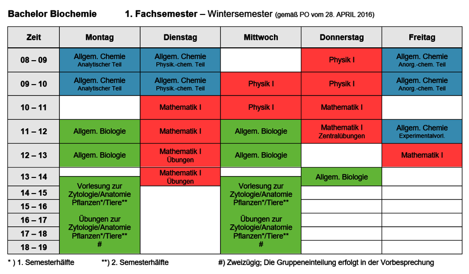 Zusätzlich zu den Stundenplänen (öffnet neues Fenster). (nicht barrierefrei) findest du weitere Informationen zu den Lehrveranstaltungen auf der Website zum Bachelor-Studiengang Biochemie.