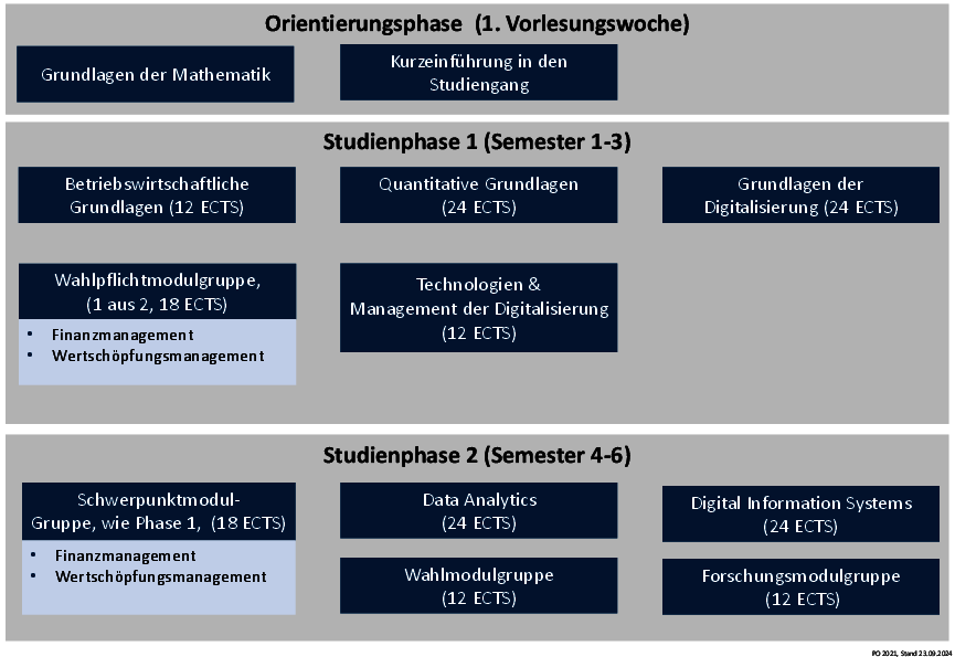 - Die erste Studienphase dient dem Erwerb studiengangspezifischer Grundlagen und Methodenkompetenz in der Betriebswirtschaftslehre sowie in den Bereichen Digitalisierung und Technologiemanagement.