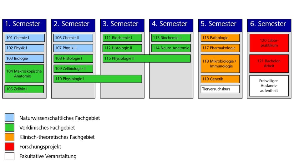 In den ersten beiden Semestern findet Unterricht in den Naturwissenschaften Chemie, Physik und Biologie statt. Mit der makroskopischen und mikroskopischen Anatomie (Histologie) werden erste medizinnahe Einblicke gewonnen, und in den beiden Zellbiologiemodulen beginnt bereits die praktische Arbeit im Labor.