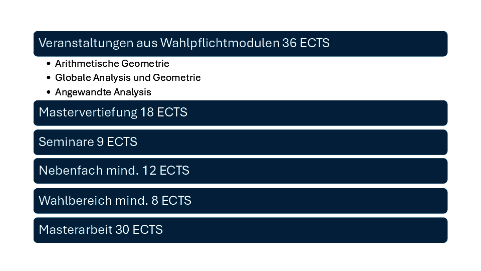 - Äußerst reichhaltiges Angebot an Lehrveranstaltungen zur Vertiefung in den Forschungsschwerpunkten „Angewandte Analysis“, „Arithmetische Geometrie“ und „Geometrie und Globale Analysis“.
