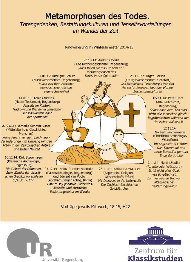 Im Rahmen der Buchpräsentation vom 07. Mai stellten Prof. Dr. Andreas Merkt und Prof. Dr. Tobias Nicklas das "Handbuch zur Geschichte des Todes im frühen Christentum und seiner Umwelt" als Gesamtprojekt sowie den bereits erschienenen Band Dresken-Weiland, Jutta/Angerstorfer, Andreas/Merkt, Andreas, Himmel- Paradies - Schalom. Tod und Jenseits in christlichen und jüdischen Grabinschriften der Antike, Regensburg: Schnell & Steiner 2012 vor.