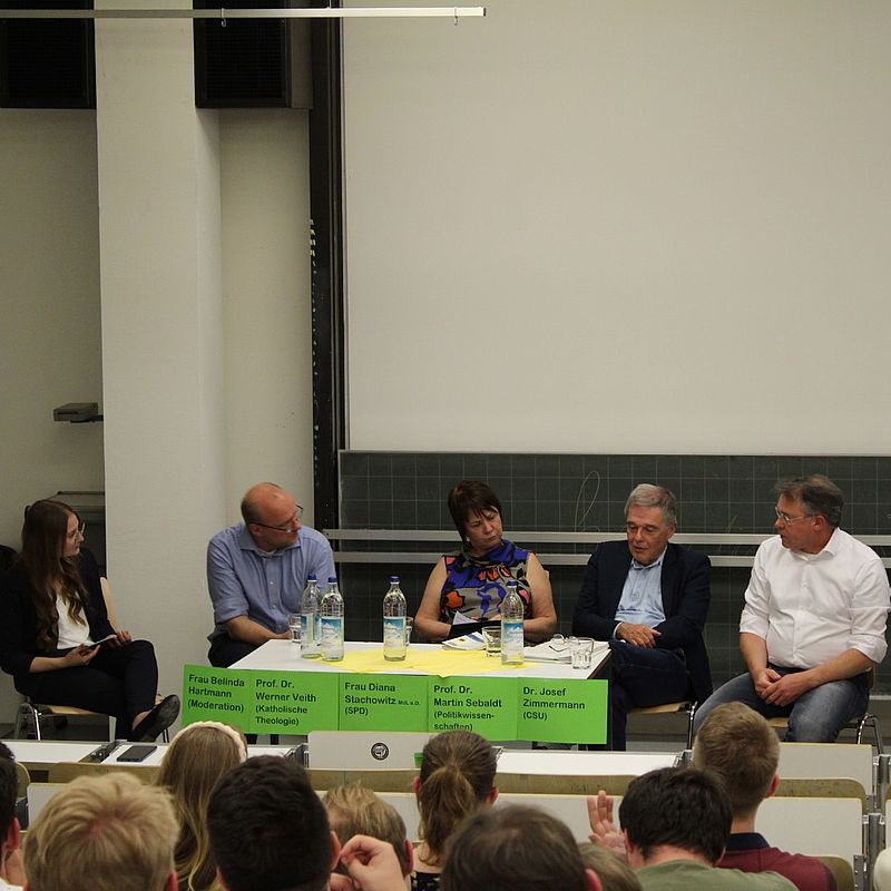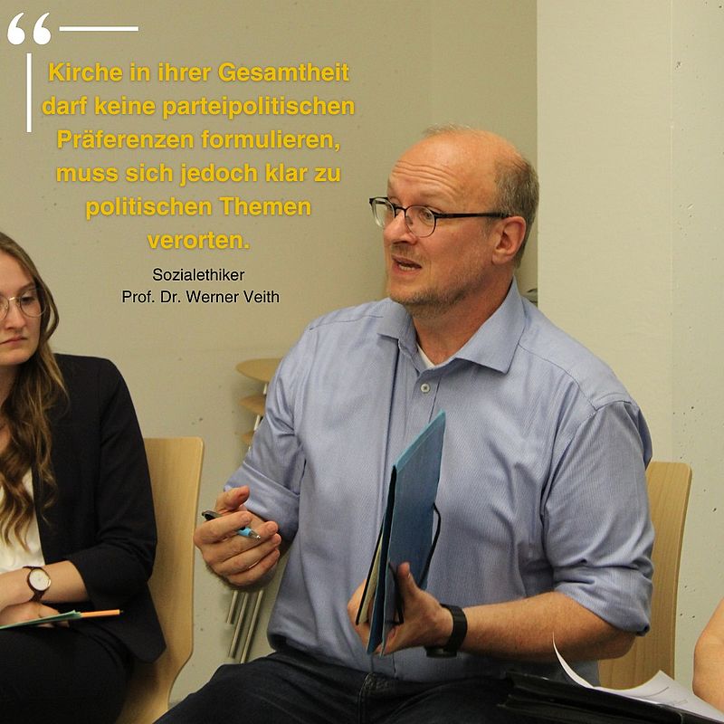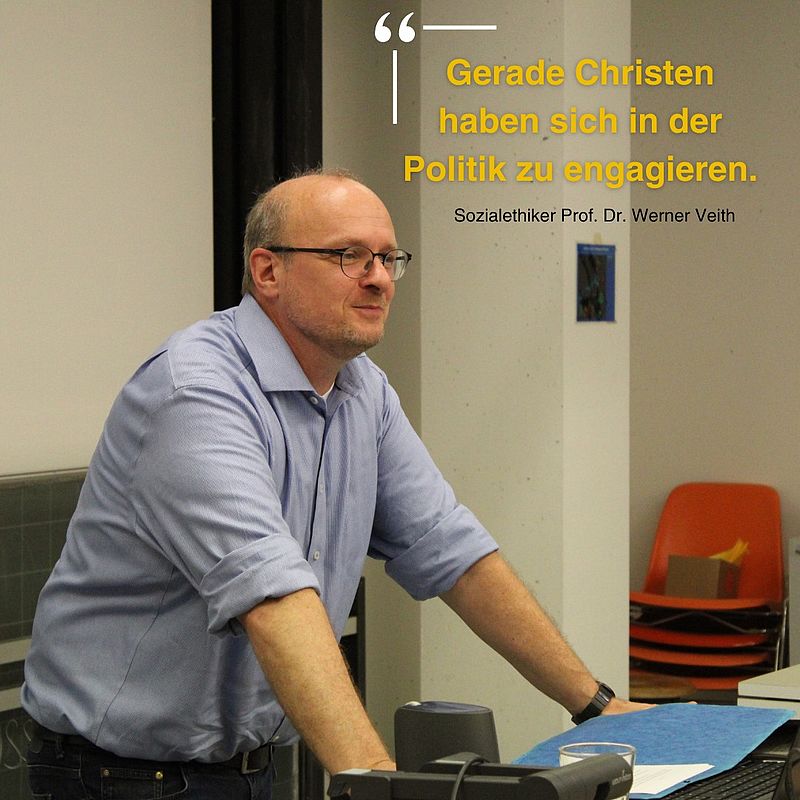 Nachdem sich zahlreiche Studierende im Hörsaal eingefunden hatten, um die Debatte zu verfolgen, eröffnete Sozialethiker Veith die Runde: Gerade Christen hätten sich in der Politik zu engagieren. Dies gebiete nicht nur das Gebot der Gottes- und Nächstenliebe, sondern auch der Umstand, dass in der Zusicherung des Reiches Gottes durch Jesus auch der Anspruch stecke, für die Vorbereitung dieses Reiches Gottesin der Welt Verantwortung zu übernehmen. Außerdem sei es die Aufgabe der Christen, wie das Zweite Vatikanum festgestellt habe, die Zeichen der Zeit zu suchen und im Licht des Evangeliums zu deuten. Daher müssten sie sich zu Phänomenen wie der Gleichberechtigung der Geschlechter, der ökologischen Krise oder Digitalisierung verhalten und diese mitgestalten. Kirche in ihrer Gesamtheit sei stets in einem Lernprozess durch das Gespräch mit allen Menschen guten Willens. Sie dürfe daher keine parteipolitischen Präferenzen formulieren, müsse sich jedoch klar zu politischen Themen verorten.
