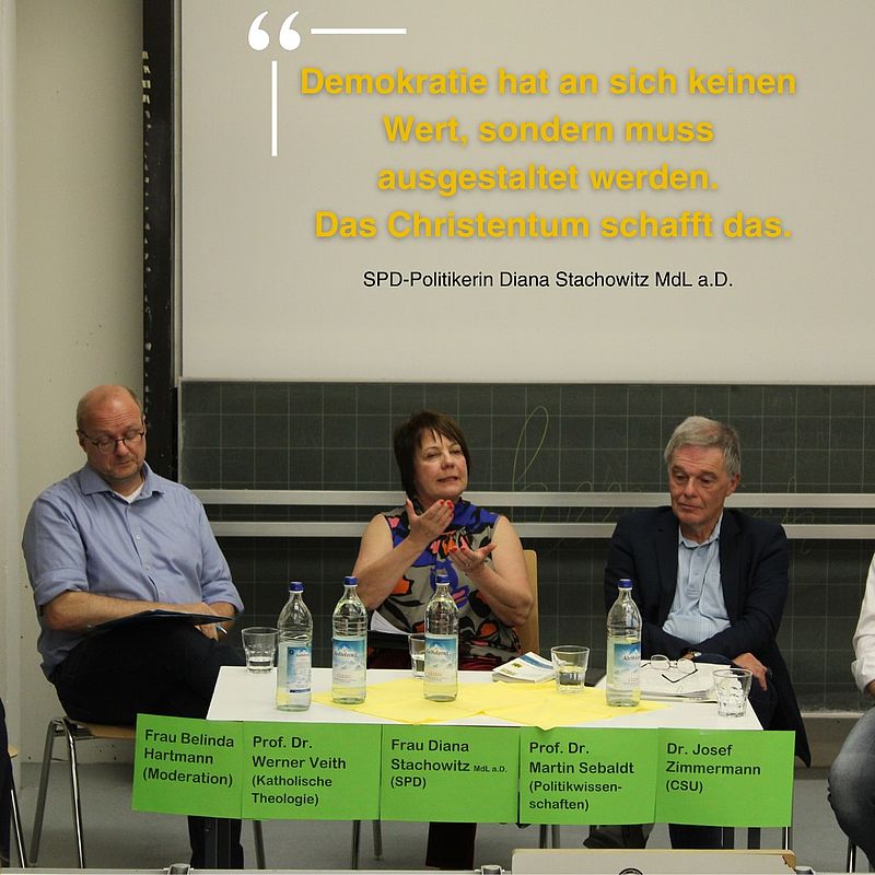 SPD-Politikerin Stachowitz argumentierte, die Demokratie habe an sich keinen Wert, sondern sei auszugestalten, was das Christentum schaffe. Das Kooperationsmodell ermögliche dies. Christliche Werte seien als Fundament der Gesellschaft dringend zu erhalten. Jedoch müsse man über gewisse Vorrechte der Religionsgemeinschaften, wie etwa das kirchliche Arbeitsrecht, ernstlich in Diskussion treten.