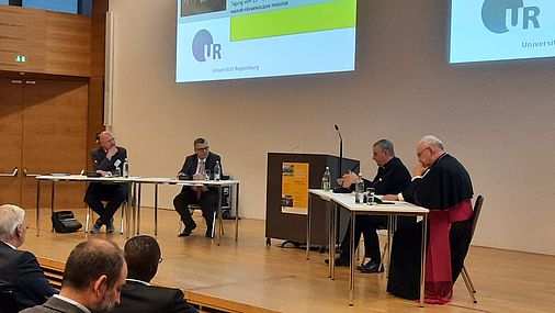 Zunächst erklärte Staatsminister Dr. Florian Herrmann die Absicht und das Interesse des Freistaates am Festhalten des Konkordats von 1924, von dem Staat und Kirchen in Bayern immer noch profitieren. Der Apostolische Nuntius unterstrich das 75-jährige Bestehen des Grundgesetzes Deutschlands, ging auf die Bedeutung des Konkordatsrechts als ein wichtiges Mittel zur Ordnung der Beziehungen ein und betonte die Weiterführung und Pflege der guten Zusammenarbeit zwischen Staat und Kirche in Deutschland. Der Bischof von Regensburg unterstrich die im Bayerischen Konkordat enthaltenen Vertragsgegenstände, wie den Religionsunterricht, die Kirchenfinanzierung oder die Theologischen Fakultäten an den staatlichen Universitäten, bei denen das Zusammenwirken von Staat und Kirche sichtbar wird. Weitere Fragen bezogen sich auf die Kirchenfinanzierung, die sogenannten Konkordatslehrstühle sowie die Besetzung von Bischofsstühlen. Nach eineinhalb Stunden beendete Prof. Dr. Martin Löhnig die Podiumsdiskussion.