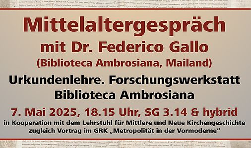 Herzliche Einladung zum Gastvortrag im Rahmen der Mittelaltergespräche mit Dr. Federico Gallo am Mittwoch, den 7. Mai, um 18.15 Uhr in SG 3.14 (Forschungsraum Beyond Canon_). Dr. Gallo ist Direktor der Biblioteca Ambrosiana in Mailand und hat ein vielbeachtetes Handbuch zur Urkundenlehre vorgelegt. Sein Vortrag trägt den Titel "Urkundenlehre. Forschungswerkstatt Biblioteca Ambrosiana" und nimmt aktuelle Entwicklung an der von ihm geleiteten Bibliothek in den Blick.